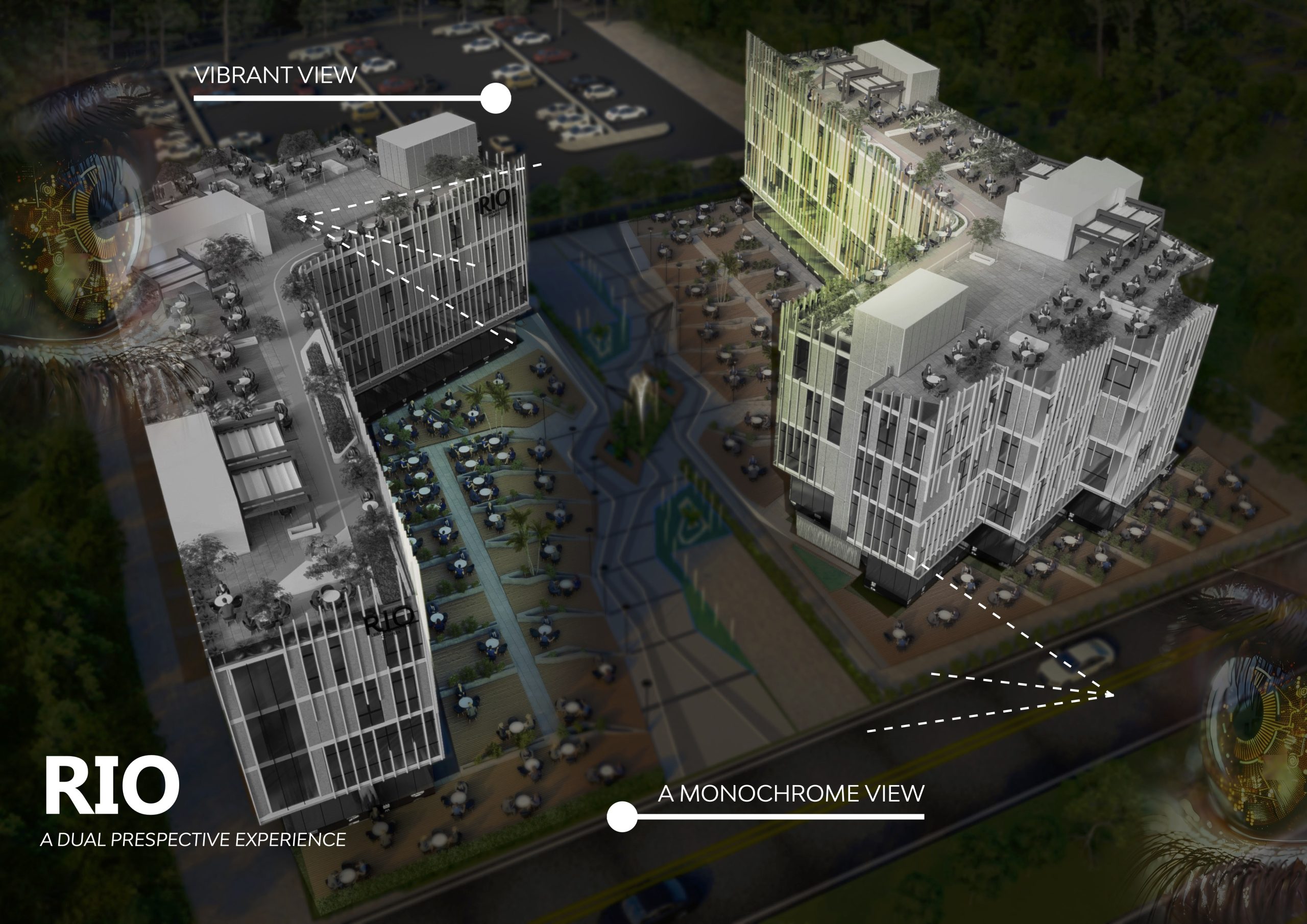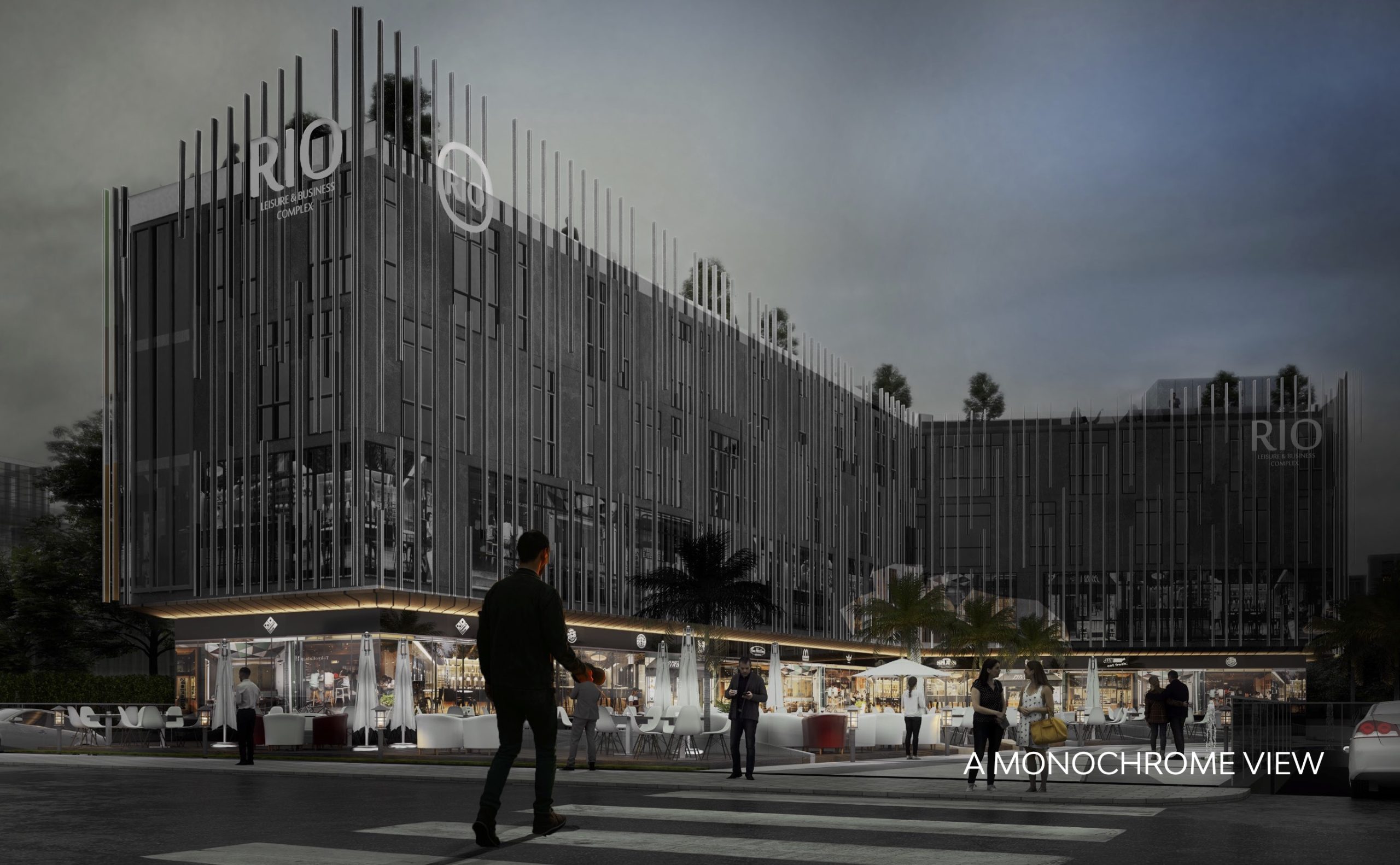The concept behind rio is While you are looking from the street view, you will see rio in a black and white suit while parking side represents colorful architecture, Which is everyside tells a story of elegant architecture theme.